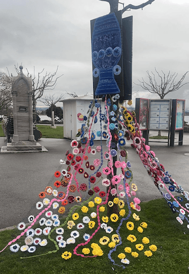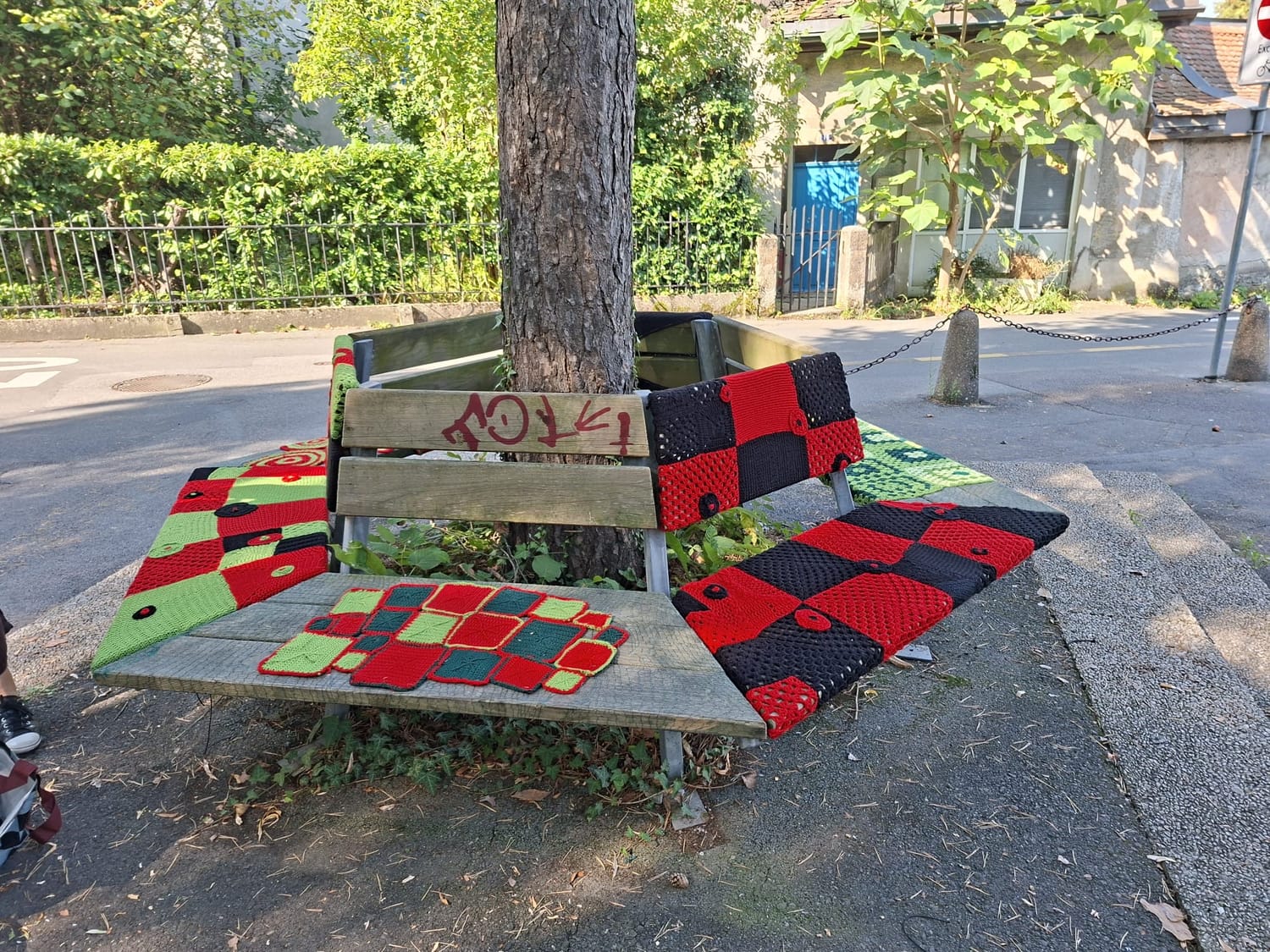 Nous embellissons des bancs avec des carrés ou autres motifs, des jardins avec des filets de fleurs, des poules et des oiseaux dans les jardins, des chaînes en laine sur des barrières.